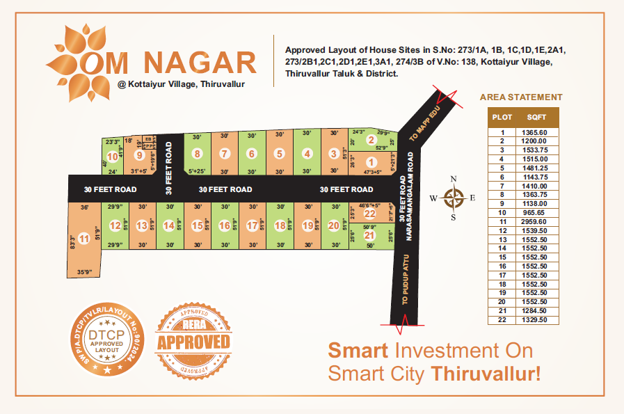 MS Propeties OM Nagar, A secured DTCP, RERA Approved plotted community situated in Kottaiyur Vilalge, Tiruvallur. Located close to the MMLP Logistics Park. wide outer ring road and the project is with a total of 22 beautiful plots ranging from 965 to 2965 sqft.